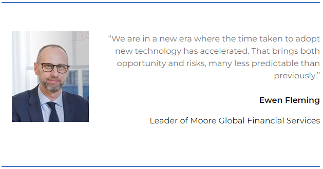 “Technologies, from smartphone apps to blockchain, have fundamentally changed the way financial services are delivered, enabling customers to choose from a wider range of financial products and make decisions faster than ever before,” says Ewen Fleming, head of consulting at Johnston Carmichael and leader of Moore Global financial services group.