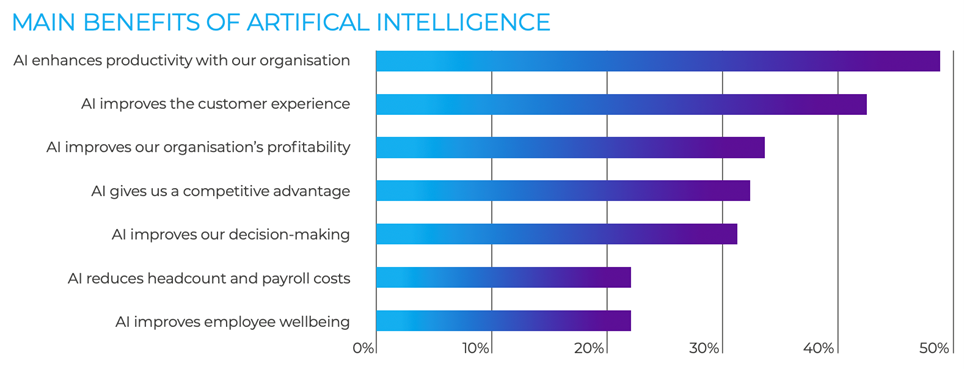 The next most common response was that AI helps to improve the customer experience, a view shared by 43% of respondents.