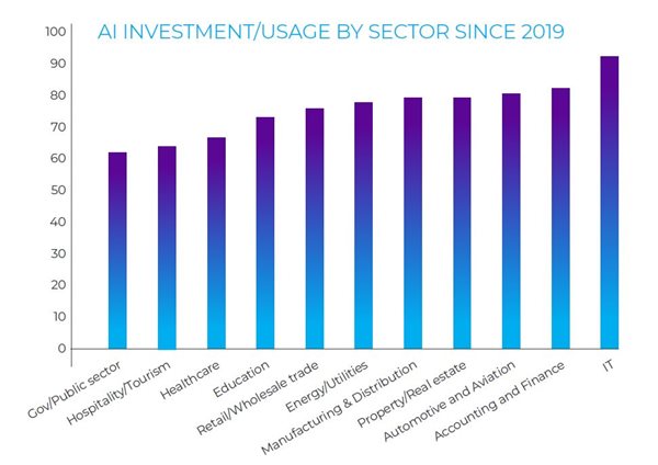 Perhaps unsurprisingly, 89% of decision makers in information, communication and technology report increased investment in or usage of AI since 2019 – the highest rate of adoption in major sectors.